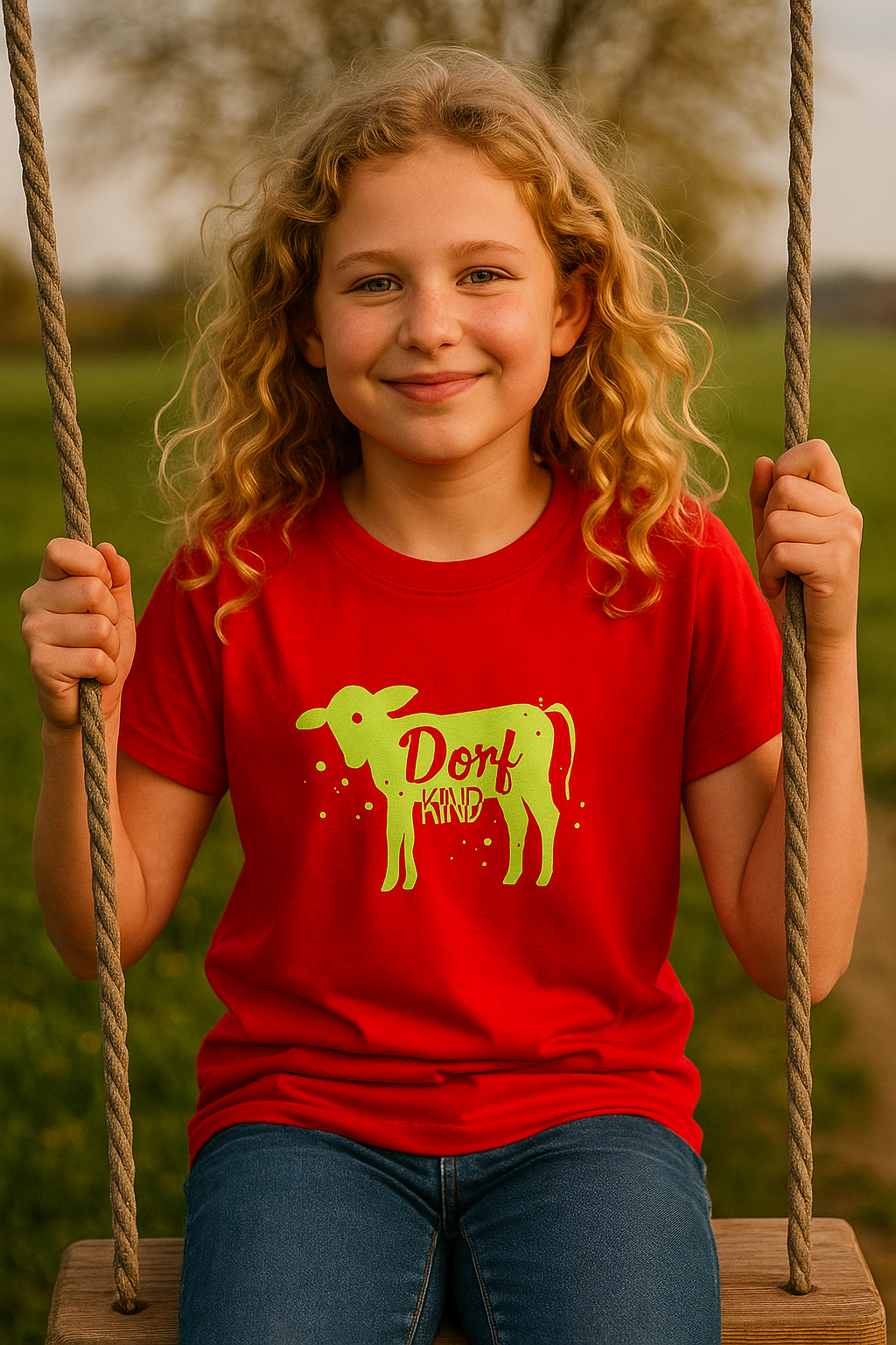 Mit unserem farbenfrohen T-Shirt "DorfKind" zeigen auch die Kleinsten,wo sie sich zuhause fühlen:
